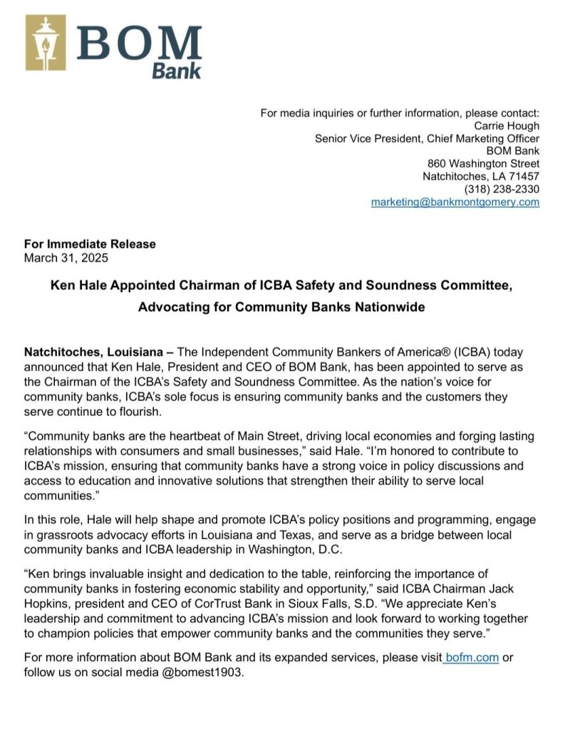 Ken Hale Appointed Chairman of ICBA Safety and Soundness Committee, Advocating for Community Banks Nationwide