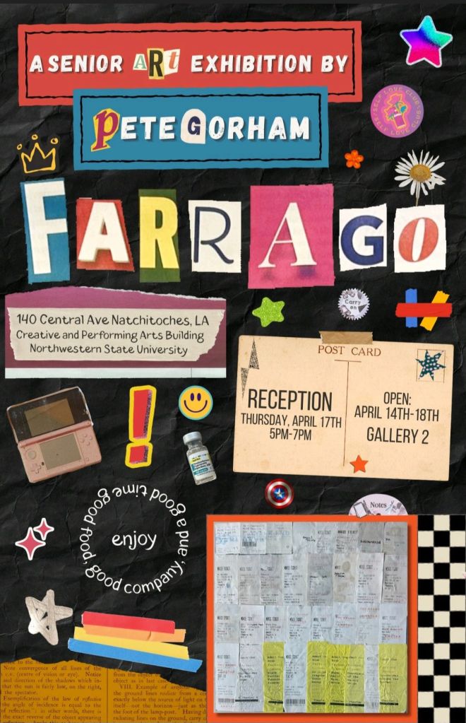 NATCHITOCHES – Artist Pete Gorham will hold his senior exhibition at Northwestern State University on April 14-18 in the Orville Hanchey Art Gallery 2. Admission is free and open to the public.