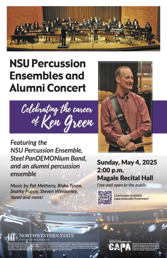 NATCHITOCHES – The NSU Percussion Studio and the Spirit of Northwestern Marching Band will conclude their Alumni Weekend with a concert on Sunday, May 4 at 2 p.m. in Magale Recital. The NSU Percussion Ensemble and Steel PanDEMONium Band will open the concert before more than 60 alumni take the stage and perform together once again.