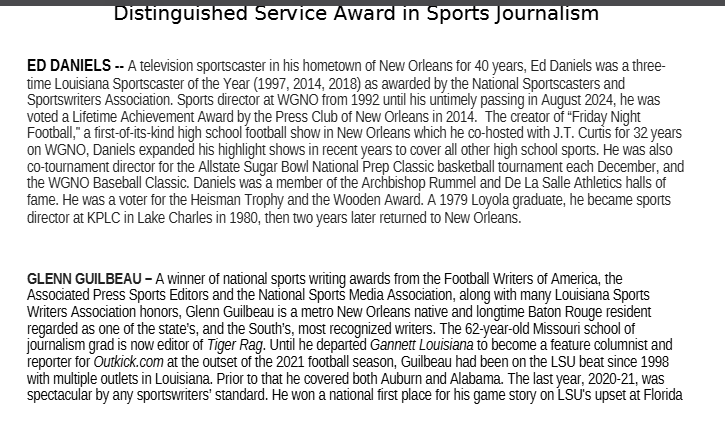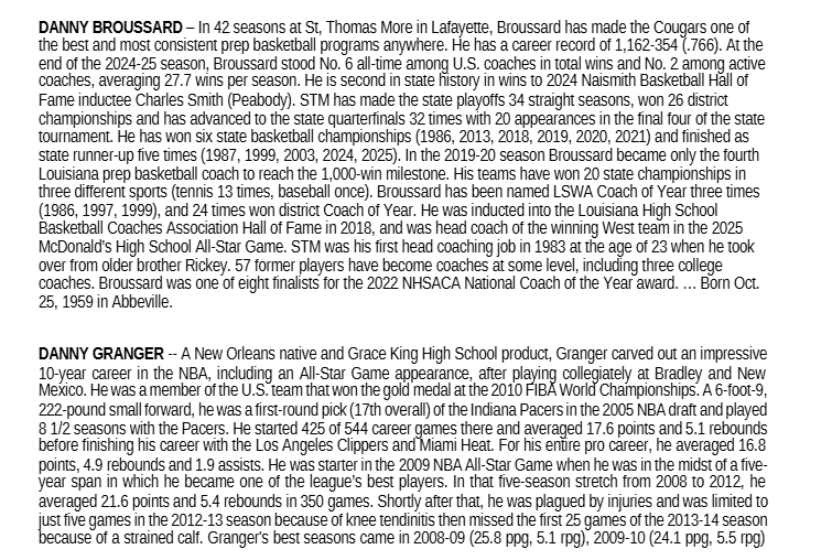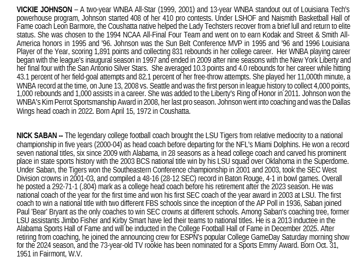 Saturday begins with the New Orleans Saints & Pelicans Junior Training Camp, a free event for kids ages 7-17 hosted on the Northwestern State campus from 9-11 a.m. Advance registration is required and available on the 2025 Induction link at LaSportsHall.com.