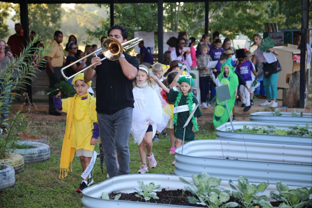 Oliver Molina, associate professor of percussion at NSU, led students in a bucket drumming performance of an original tune called “Grow, Grow, Little Seed,” sung to the tune of “Twinkle Twinkle Little Star.” His son Elliott was dressed as a farmer. Carlos Camargo Patron and his son Gabriel, dressed as sunshine, led a second line through the garden with Camargo Patron playing “Oh When the Seeds Get Planted Snug” on trombone to the tune of “When the Saints Go Marching In.”