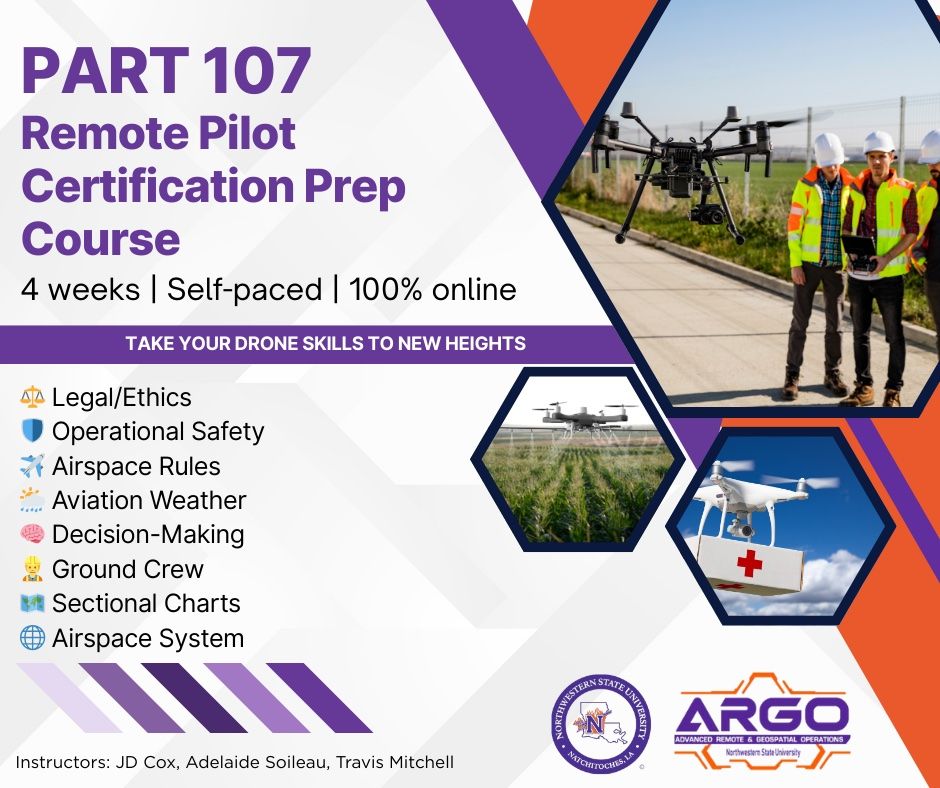 NATCHITOCHES – Northwestern State University is offering Part 107 Remote Pilot Certification Prep Course, a comprehensive four-week self-paced training to prepare individuals for the FAA Remote Pilot Certification Exam.