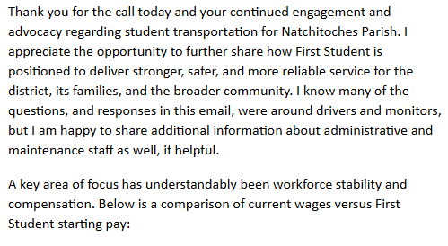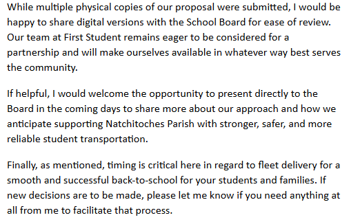 These details are shared to provide full transparency into the heated debate that culminated in the Natchitoches Parish School Board’s February 10 decision to renew the student transportation contract with Ecco Ride for the 2026–2027 school year. See the full breakdown of the higher-compensation proposal from a competing bidder that was ultimately not selected.