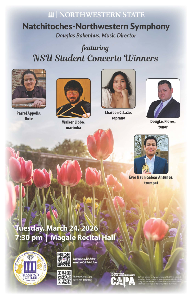 Featured performers will be NSU Concerto Contest winners Parrel Appolis on flute, Walker Libbe on marimba, soprano Lhareen C. Lazo, tenor Douglas Flores and Ever Naun Galeas Antunez on trumpet.