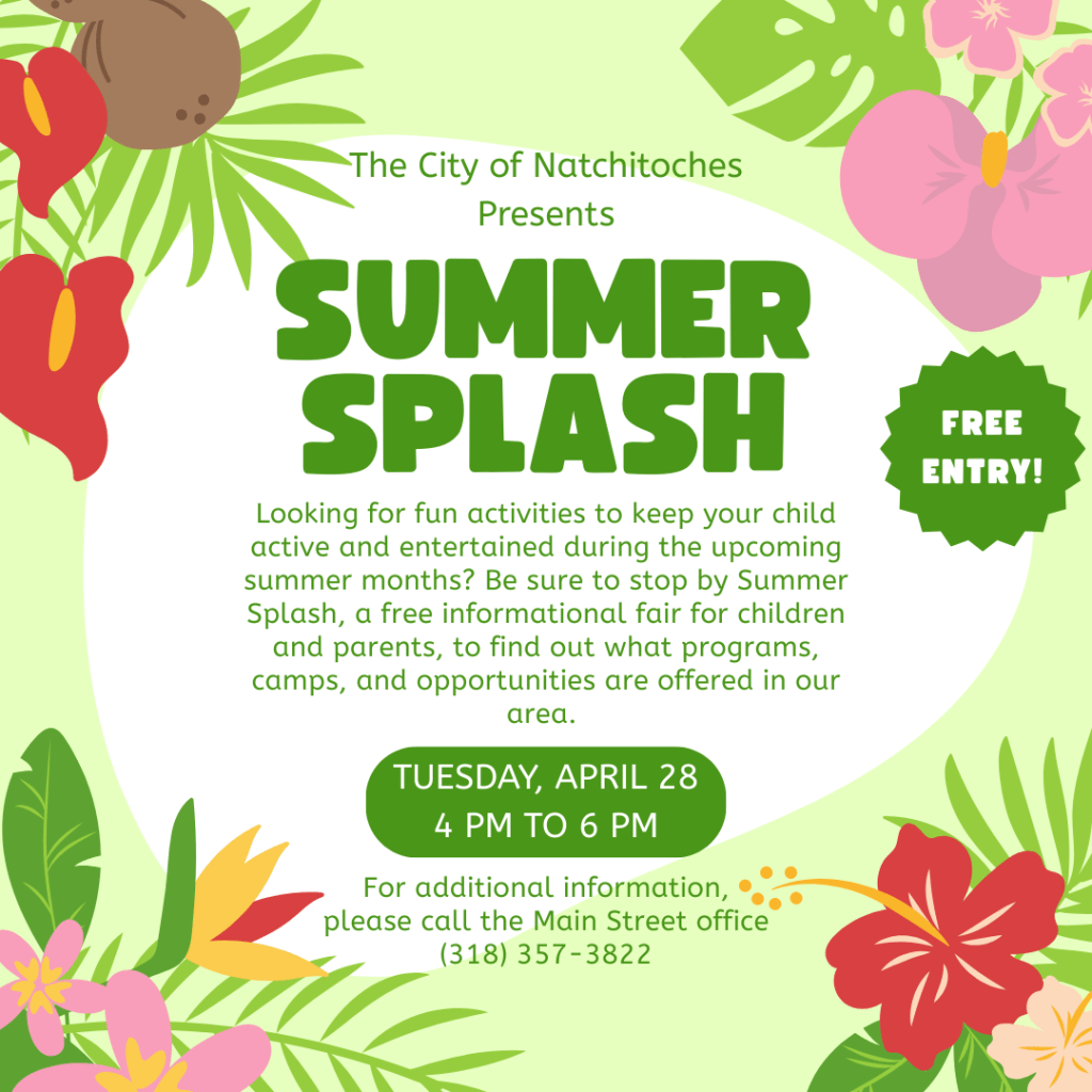Summer Splash, organized by the Natchitoches Main Street Program, is designed to connect families with local organizations offering summer camps, educational programs, recreational activities, and youth opportunities. Attendees will have the chance to gather information, meet program representatives, and register for upcoming summer offerings.